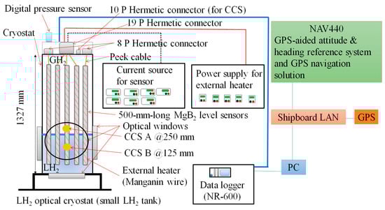 Figure 4 shows the measurement system. It consists of an optical cryostat (a small LH2 tank), five MgB2 level sensors, two carbon ceramic temperature sensors (CCSs), a digital pressure sensor, current sources for the level sensors and CCSs, a power supply for the external heaters of the level sensors, a data logger (NR-600; Keyence, Osaka, Japan), a GPS-aided microelectromechanical inertial system (NAV440; Memsic, Andover, MA, USA), and a PC. The A and B CCSs were attached to the level-sensor support at distances of 250 and 125 mm, respectively, from the bottom of level Sensor B1. Data regarding liquid level, temperature, and pressure inside the cryostat were obtained by the data logger, and data regarding ship motion (in the form of accelerations in the X, Y, and Z directions) were obtained by the inertial system through a shipboard local area network. All the data were collected synchronously by the PC in conjunction with the GPS clock.