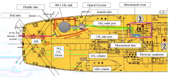 - Maekawa, K.; Takeda, M.; Hamaura, T.; Suzuki, K.; Miyake, Y.; Matsuno, Y.; Fujikawa, S.; Kumakura, H. First experiment on liquid hydrogen transportation by ship inside Osaka bay. IOP Conf. Ser. Mater. Sci. Eng. 2017, 278, 12066. [Google Scholar] [CrossRef]