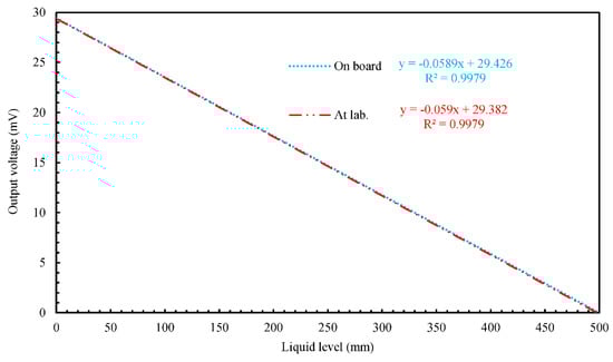 To investigate the influence of disturbances, such as onboard noise, we examined the static level-detecting characteristics of the five 500 mm long MgB2 level sensors onboard. We did this by determining the relationship between the sensor output voltage and the liquid level at atmospheric pressure and a heater input of 9 W while we decreased the liquid level (i) from 130 to 85 mm for Sensors A1 and C, and (ii) from 100 to 55 mm for Sensors A2, B1, and B2. The liquid-level ranges observable from the optical windows were 85–130 mm at Sensors A1 and C, and 55–100 mm at Sensors A2, B1, and B2 because the vertical positions of the windows differed in the X and Y directions. In this experiment, we used a four-wire technique to measure sensor output voltage. The onboard and laboratory [] results are compared in Figure 8. This figure shows the linear approximate curved line except the experimental result for ease of viewing. The gradients of the straight lines approximating the onboard and laboratory data agree with each other, as do the relevant Y intercepts. No influence of disturbances can be seen in Figure 8. The results from the other sensors show similar tendencies.