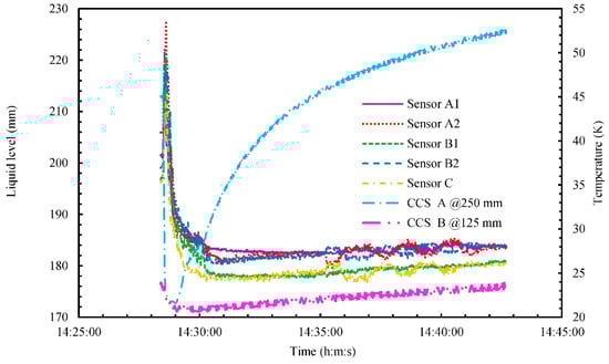 Figure 9, Figure 10 and Figure 11 show the experimental results for liquid level, temperature, pressure, ship motion, and accelerations during marine-transportation test ⑤ from 14:28 to 14:42 at 1 s intervals. As shown in Figure 9, the liquid level increased rapidly from around 200 to 220 mm, as indicated by all five MgB2 level sensors. This was due to bumping of the LH2 surface, with the temperature of CCS A at the position of the gaseous phase rapidly decreasing, from around 45 to 21 K after 14:28. This is because mist occurred in the LH2 space. This phenomenon was observed by the naked eye.