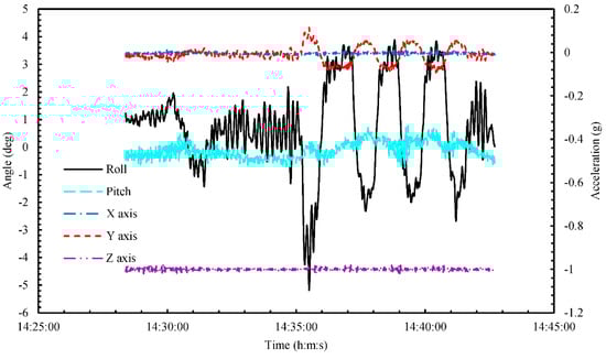 Time series of angle and acceleration during marine-transportation test ⑤ from 14:28 to 14:42.