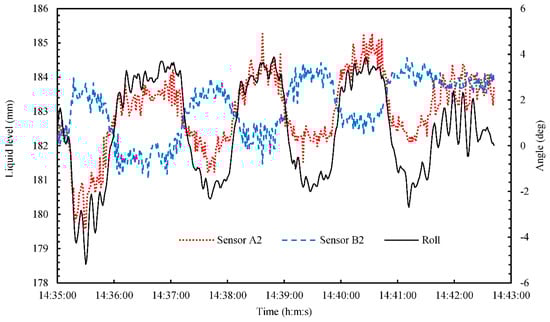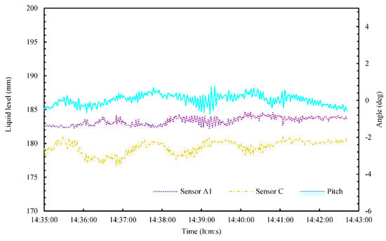 Figure 12 shows the time series of the liquid level and rolling angle during the zigzag maneuver (14:35–14:42). In this figure, the error bar of liquid level and rolling angle were omitted to understand the time variation. To clarify the relationship between liquid level and rolling angle, we used the rolling angle and the results from Sensors A2 and B2. As shown in Figure 12, the rolling signal was in phase with that of Sensor A2, and out of phase with that of Sensor B2. The average rolling period was 114 s, and the average liquid oscillation period was 118 s at the positions of Sensors A2 and B2. Figure 13 shows the time series of the liquid level and pitching angle during the zigzag maneuver (14:35–14:42). In this figure, the error bar of liquid level and pitching angle were omitted to understand the time variation. To clarify the relationship between liquid level and pitching angle, we used the pitching angle and results from Sensors A1 and C. As shown in Figure 13, the Sensors A1 and C can be detected the small liquid oscillation with small pitching angle.