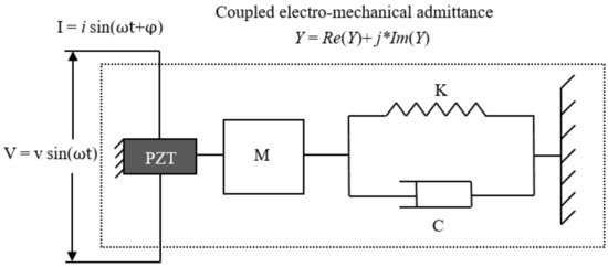 An electro-mechanical model which quantitatively describes the process is presented in Figure 2. Assuming that a surface-bonded PZT patch is attached to one end of the host structure represented by a single degree-of-freedom (DOF) system (i.e., a spring–mass–damper system), the other end of the PZT patch is fixed. The PZT patch considered to be a thin bar which vibrates axially when an alternating voltage is applied. Liang et al. [23] demonstrated that the electric admittance Y() (which is an inverse of the electrical impedance Z()) of the PZT actuator is a combined function of the mechanical impedance of the PZT actuator Za() and that of the host structure ZS(), as shown in the following equation: