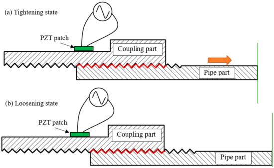 For a threaded pipe connection, looseness always occurs with a decrease of the contact area of the thread interface between the coupling and pipes, as shown in Figure 3. Due to the change in the contact area, the variation of the structural mechanical properties, including the structural stiffness and damping ratio, will directly influence the mechanical impedance of the host structure. According to the PZT-driven impedance model introduced in Section 2.2, when a PZT patch is surface bonded onto the coupling of the threaded pipe connection, the PZT electrical impedance signature is coupled with the mechanical impedance of the host structure. Therefore, the looseness of the threaded pipe connection can be determined by monitoring the variation of the electrical impedance signatures of the PZT patch.