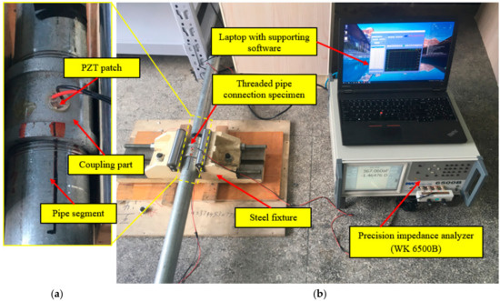 Two pipe segments coupled with a threaded fitting were assembled in the laboratory to simulate the threaded pipe connection, as shown in Figure 4. The test specimen was fixed by a steel fixture. A PZT patch was mounted on the surface of the coupling part. The geometries and material parameters of the test specimen and PZT patch are shown in Table 1.