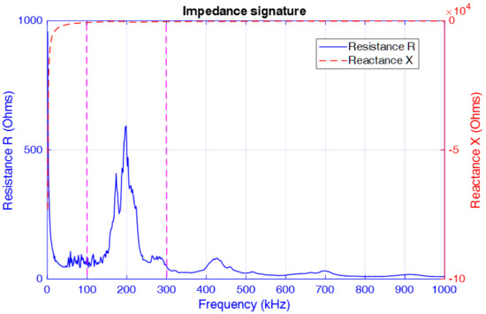 Measured electrical impedance signatures of the PZT patch (100 kHz–300 kHz).