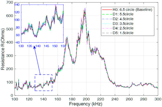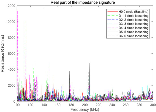 The real part of the impedance signatures for the threaded pipe connection model with different loosening circles (100 kHz–300 kHz).
