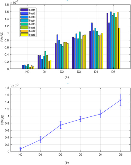 Repeatability of the proposed method and consistency of the test results are important for practical applications. Therefore, repeated tests, eight repetitions in this research, were investigated. The eight repeated tests were conducted in the same laboratory environmental conditions. Therefore, the environmental factors (such as temperature, moisture, pressure, etc.) were considered constant and did not affect the test results. A discussion of the influence of the environmental factors can be found in Section 4.3. Each time, the pipe segment was rotated from the tightest condition (6.5 circles, baseline, H0) to the loosest condition (1.5 circles, D5), and the proposed EMI-based loosening monitoring method was performed. The final eight repeated test results are shown in Figure 9 and Table 2, in which the mean values and standard deviations of the RMSD-based looseness indices under each loosening severity were calculated. On the other hand, considering the fact that the baseline impedance signatures play an important role in the procedure of RMSD-based index calculation, the stability and consistency of these baseline impedance signatures in the eight repeated tests were also investigated.