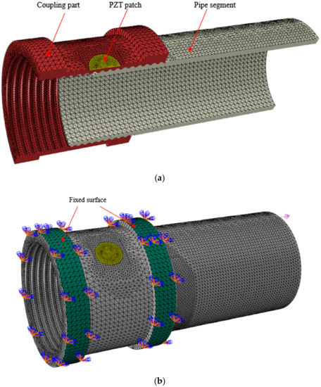 As shown in Figure 10a, a coupling and a pipe segment were first established and assembled together as the test specimen, and a PZT patch was also established and then bonded on the outside surface of the coupling. All the geometric details and material properties of the connection model and PZT patch are the same as those in the previous experimental investigation, as shown in Table 1. For the boundary conditions of the model, two surfaces of the coupling were fixed in the investigation, as shown in Figure 10b.