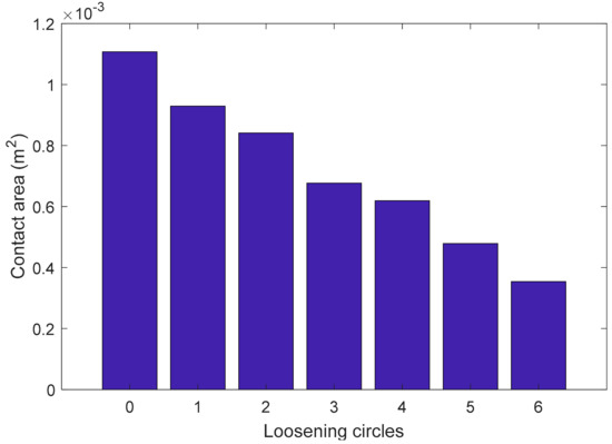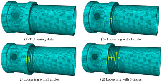 In the simulation investigation, the coupling and the pipe segment were well engaged by the tooth bite, as shown in Figure 10a, and the loosening severities were introduced by rotating the pipe segment along the loosening direction with different rotation circles from 0 to 6 circles, as shown in Figure 11. Here, when the coupling was well tightened and no looseness occurred, the rotation circle of looseness was zero, as shown in Figure 11a, which was regarded as the healthy baseline condition in the following analysis. From the figure, it is clear that the contact area of the thread interface between the coupling and the pipe segment decreases with the development of loosening severity. In the simulation procedure, the contact area of the connection with different rotation circles was calculated and collected, as shown in Table 3 and Figure 12.