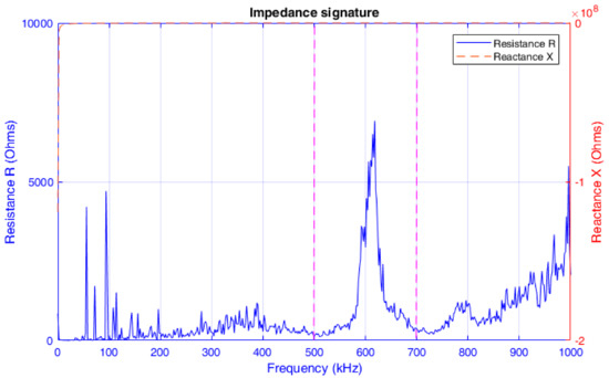 Electric impedance signature acquired from the PZT patch (1 kHz–1 MHz).