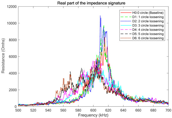 The real part of the impedance signatures for the threaded pipe connection model with different loosening circles (500 kHz–700 kHz).