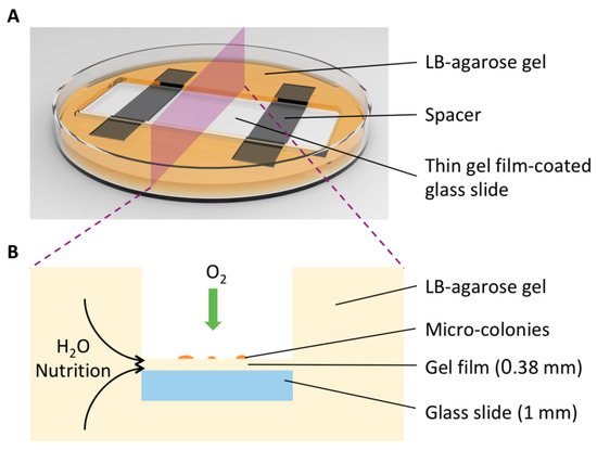Schematics of the reported custom-built on-glass-slide microbial culturing device. (A) A thin Luria-Bertani (LB)-agarose gel film with a flat surface created on a glass slide in a petri dish. The components of the device are described. (B) A cross-section of the device showing its capability of culturing microorganisms on the thin gel film without any growth limitation.