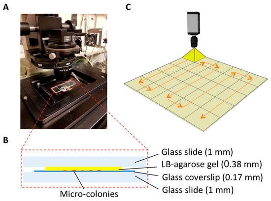 Schematic illustration of the reported micro-colony imaging system. (A) a photograph of the experimental setup. (B) The components of a sample setup. The thickness of each component is described. (C) The scanning of the entire cell culture area on thin LB-agarose gel film is conducted by sequentially capturing images in field-of-views. Each square on the plane represents a field-of-view. The arrows indicate the path of the movement of the camera.