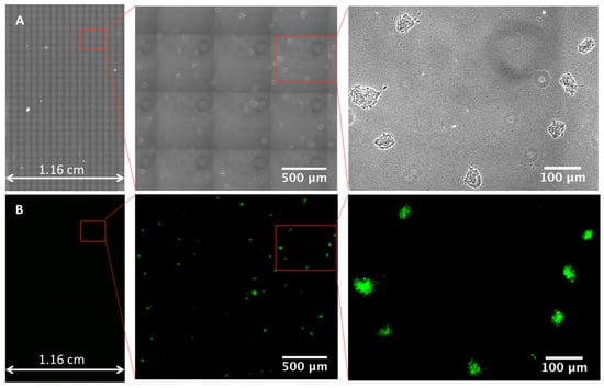 Representative images captured by using the reported platform. Transmitted light (A) and fluorescence (B) images of bacterial micro-colonies presented on an area of 1.16 cm × 1.81 cm. Fluorescence image was only used for confirmation purpose.