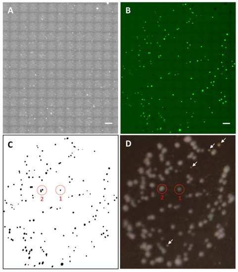 Phase contrast (A) and fluorescence (B) images of an area (7.9 mm × 9.0 mm) containing micro-colonies grown from the inoculated cells in 5 μL bacterial suspension. Scale bars: 500 μm. Fluorescence image was only used for confirmation purpose. (C) An image processed from the raw image in (A). The black spots indicate micro-colonies. (D) A photograph of visible colonies in situ developed from the micro-colonies shown in (A,B). The whitish dots were bacterial colonies. The objects pointed by the white arrows were debris, which can be distinguished from the bacterial colonies by the colors. The difference in color can be more easily identified from the high-resolution photograph shown in Figure S3.