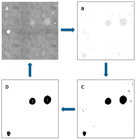 An example of automated enumeration of micro-colonies. The original transmitted light image (A) was processed through adjusting threshold (B), finding edges, binarization, and filling the holes (C), and the black regions above certain size were counted by using ImageJ (D).