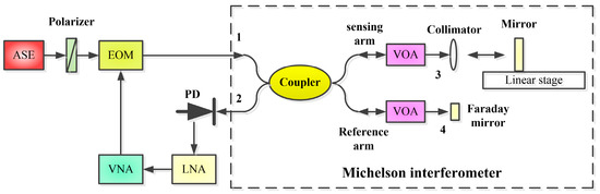 The experimental setup is shown in Figure 1. The light source was a pigtailed broadband amplified spontaneous emission (ASE), which emitted white light with a central wavelength of 1545 nm and with a spectral bandwidth of 42 nm. The output optical power of the ASE was 20 mW. The white light was polarized by an optical fiber polarizer and then amplitude-modulated by a RF signal from the output port of a vector network analyzer (VNA) using an electro-optic intensity modulator (EOM) that was biased at quadrature. The half-wave voltage of the EOM (EOspace, AX-OMKS-20-PFA-PFA-LV) was 3.6 V at 1 GHz with an insert loss of 3.1 dB and a bandwidth of 20 GHz, respectively. The bias of the EOM was controlled by a circuit module (YYLab, MCB1) at quadrature. The intensity-modulated light from the EOM was injected into one of the input ports of a 2 × 2 directional single-mode optical fiber coupler which was used as an MI. One of the output arms was the sensing arm that connected an optical fiber collimator and the output light from the collimator is incident on a scanning mirror directly. The reflection light from the mirror was coupled into the collimator again. The other output arm of the interferometer was a reference arm with a programmable optical delay line and the output end was connected to a Faraday mirror. The Faraday rotation mirror was used in the reference arm to eliminate the influence of polarization fluctuation on the performance of the sensor. There were variated optical attenuators (VOA) in the two output arms of the interferometer. The function of the two VOAs was to adjust the optical power of the two reflection lights to be equal. The two reflection lights from the two arms were received by a high-speed photodiode. The microwave interference fringes were formed by the high-speed photodiode. The microwave interference fringes signal from the PD was amplified by a low noise amplifier (LNA) and the amplified RF signal was injected into the VNA. The VNA was used to measure the microwave response function of the sensor, and the two ports of the VNA were connected to the EOM and the LNA.