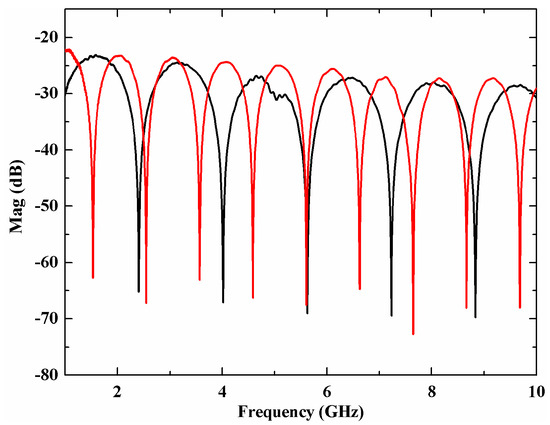 Measured S21 parameter before (black line) and after (red line) the displacement of the mirror.