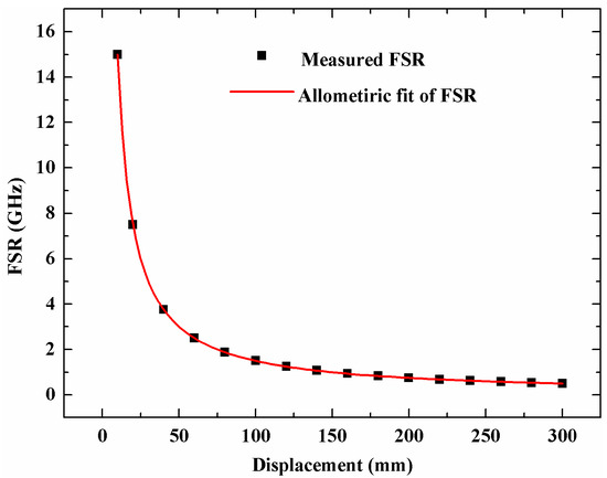 The FSR from Figure 3 is 1.60712 GHz and 1.01807 GHz, and the calculated displacement is 540.029 mm, which agrees well with the displacement of the linear stage. We move the scanning mirror with several different displacements and record the microwave response function and then obtain the FSR at different displacements. Figure 4 shows the relationship between the displacement and the FSR and their line fitting results. The fitting expression is , and the correlation coefficient is 0.99995. The fitting result agrees well with Equation (10) where the theoretical expression is .