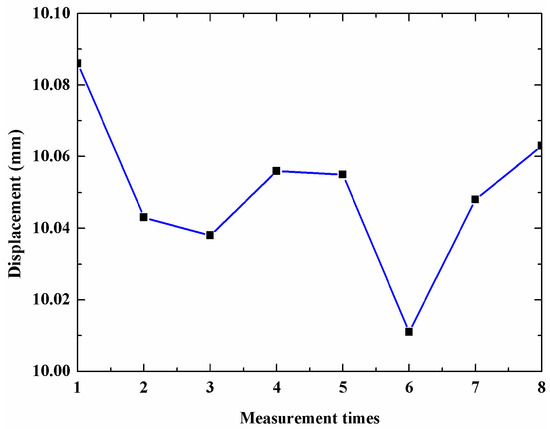 To check the stability of the sensor, we move the scanning mirror with 10 mm ten times and use the proposed sensor to measure the displacement of the mirror. The measurement results are shown in Figure 5. The mean is 10.1052 mm and the standard deviation is 22 μm.