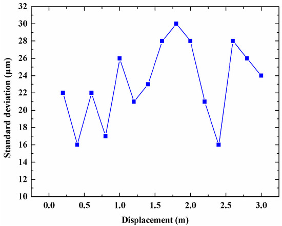 We also evaluate the displacement measurement standard deviation at different displacements from 200 mm to 3 m, and the measurement results are shown in Figure 6. The measurements at each displacement were conducted 10 times. As Figure 6 shows, the largest measurement standard deviation is 31 μm when the displacement is within 3 m. The minimum achievable increase of the motorized linear stage is 1 μm whose displacement error can be ignored in the measurement result, so the displacement measurement resolution of the proposed sensor was 31 μm.