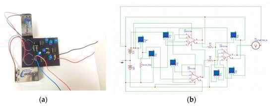 To detect the signal, we made a cost-efficient circuit with components such as resistors, potentiometers, op-amp (model name: LM741 CNNS) [41], and 9 V battery. The printed circuit board (PCB) was designed by OSHPARK (a PCB fabrication company, Portland, OR, USA) [42]. As shown in Figure 1, we used 10 MΩ and 50 MΩ resistors connected with a single pole double through (SPDT) switch [43] for compatible adjustment with the sensor resistance while testing different ranges of acetone concentration. A 10 MΩ resistor was used to calibrate the sensing response for lower concentrations of acetone from 0 to 6.25 ppm and a 50 MΩ resistor was chosen to calibrate the sensing response for a broad range of acetone from 0–50 ppm. The other branch of the Wheatstone bridge was introduced with a potentiometer to make zero correction of the circuit. Also, we introduced buffer amplifiers [44] in the circuit to avoid the impedance problem and to get unity gain. Because the signal from sensor detection is weak, we used a differential amplifier to amplify the signal. The voltages were taken from the two branches of the Wheatstone bridge. The amplification ratio was set up in accordance with the range of acetone detection. For instance, to detect a low concentration of acetone (0–6.25) ppm, we needed to amplify the signal 10-fold. Figure 2a shows our PCB circuit board and Figure 2b shows the schematic diagram of the circuit. We used two 9 V batteries to make +9 V and −9 V potential differences. The amplification of the signal was set in between the range of −9 V to +9 V and the output was clipped beyond that range. The output from the circuit was measured on an electrometer.