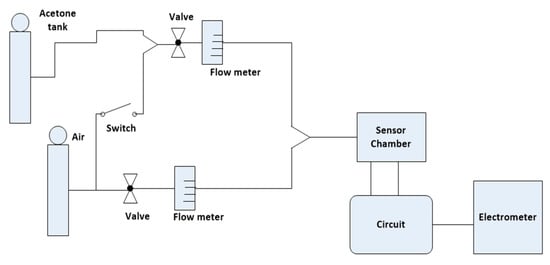 We tested the sensor with 0–6.25 ppm and 0–50 ppm concentrations of acetone. Our primary goal was to check the sensitivity of the KWO sensor to acetone with the improved circuit while the concentration of acetone was low (0–6.25 ppm). The other goal was to make sure that the circuit could functionally work nicely in a broad range of acetone concentration from 0 to 50 ppm. Figure 3 shows the sketch of the whole testing system. Acetone gas, supplied from the tank, was at the concentration of 50 ppm. The concentration of acetone could be diluted via mixing 50 ppm acetone with air and quantified through mass flow controllers. The sensor was put in a chamber and connected to the circuit for signal detection and collection. The circuit output was monitored from the electrometer and collected via computers.