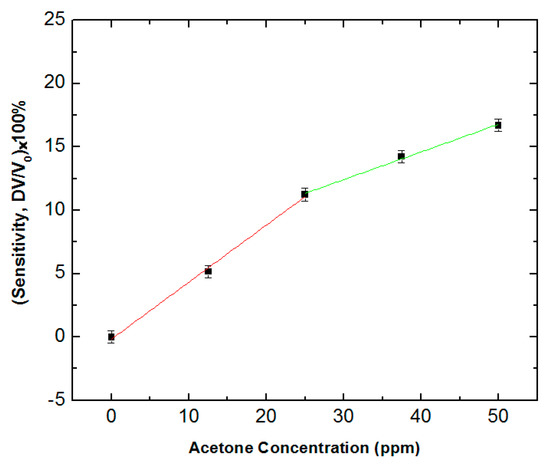 Sensitivity readings due to changes in concentration of acetone for 0–50 ppm.