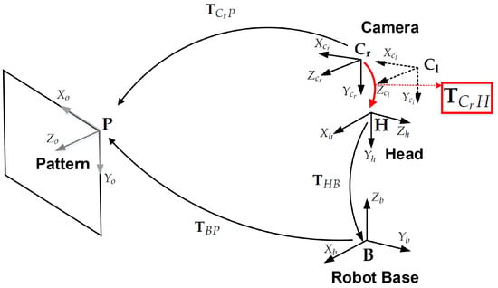 - : The unknown transformation from the right camera to the robot’s head coordinate system, which will be estimated by this calibration method,