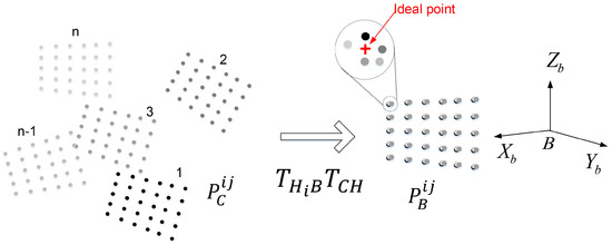 where denotes the 3D position of the j-th point at the i-th robot pose with respect to the robot base coordinate system, and denotes the 3D position of the j-th point at the i-th robot pose with respect to the camera coordinate system.