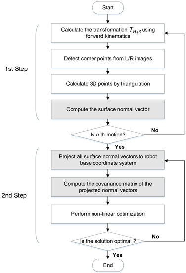 The flow chart of the proposed method consisting of the following two steps is shown in Figure 5. In the first step, we estimate transformations () from the robot’s head to the robot base coordinate system using forward kinematics, and the surface normal vectors () of the calibration plane from stereo images according to n robot poses. In the second step, the estimated surface normal vectors are projected to the robot base coordinate system, and then the solution is determined by iteratively minimizing the covariance of differences between the normal vectors. We describe the procedure of our proposed method in the following sections in more detail.