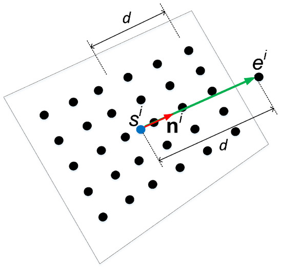 The construction of normal vectors used in this work is shown in Figure 7. The surface normal we use is a directed line segment in 3D space defined by two distinct 3D points. The starting point, , is located at the center of the calibration pattern plane and the ending point, , is located normal to and d distance above the pattern plane (i.e., , where is the unit vector normal to the pattern plane). The distance d is set to be half the length of the longer distance between the corner feature points. This distance is defined to give weight to the actual metric of the measurement. The directed line segment is constructed by connecting from to , and is the normal vector used as input for the following steps of the algorithm.