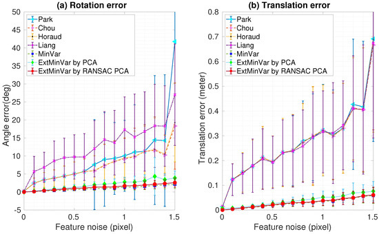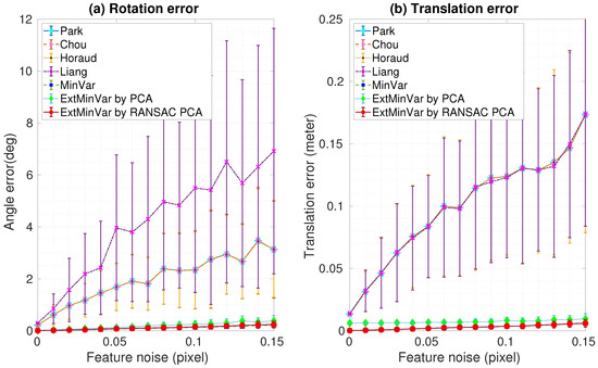 Experimental results using synthetic data with feature noise [0–0.15 pixel]: (a) Rotation error; (b) Translation error.
