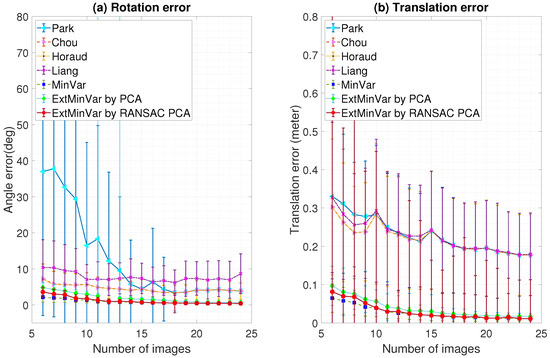 Robustness analysis in the presence of varying noise levels was performed by adding Gaussian noise to the ground truth data of the feature locations. Two datasets with different noise levels were generated for 100 trials in each experiment. We computed the mean and standard deviation of the rotation and translation errors, as shown in Figure 8 and Figure 9. As one might expect, both rotation and translation errors increased as the measurement noise increased. These experimental results demonstrated that the iteration-based methods showed better performances than those of the closed-form based methods. Furthermore, our proposed method showed similar results to those of MinVar, which outperformed other calibration methods. As mentioned before, PCA was used to compute the surface normal vectors in the proposed method, but it is known to be sensitive to outliers. The ExtMinVar by PCA method showed some degradation in accuracy compared to the MinVar method. However, improved accuracy could be obtained with the removal of contaminated data prior to the estimation of the normal vector. In practice, we removed outliers by applying a robust regression technique, namely RANSAC.