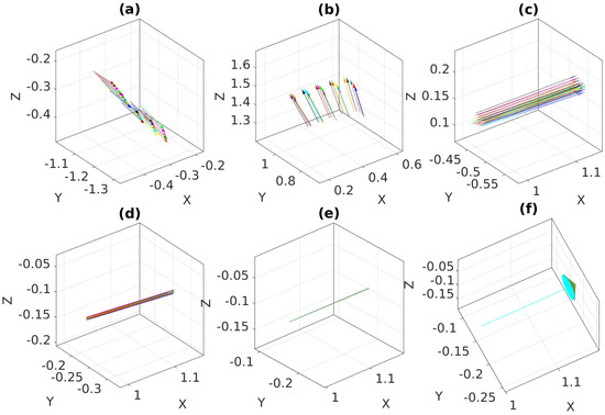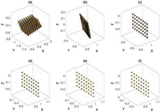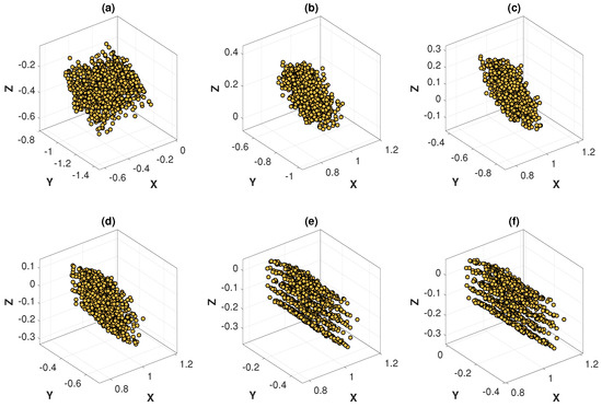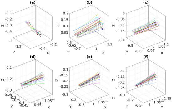 Optimization process of the MinVar method with feature noise [0–0.15 pixel]: (a) 3D points at iteration 1; (b) 3D points at iteration 6; (c) 3D points at iteration 10; (d) 3D points at iteration 13; (e) 3D points at iteration 16; (f) 3D points at iteration 27 (converged).