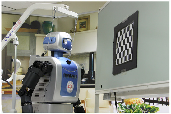 The reliability in grasping objects depends on an accurate calibration from the robot’s head to the stereo camera. Figure 17 shows the experimental setup for the head-eye calibration from the robot’s head to the stereo camera. We developed an automatic procedure to calibrate the relationship between the robot’s head and its eye by moving the robot’s head in 25 pre-planned directions, capturing left and right pattern images, and extracting the feature locations from them.