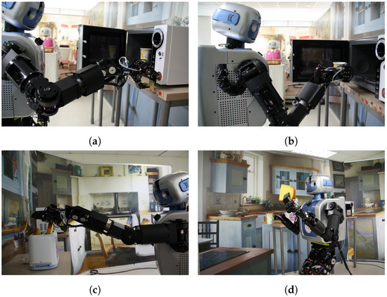 Based on the results of the head-eye calibration, the robot accomplished various domestic tasks, such as pushing a button on a microwave, grasping a cup, and delivering toast, as shown in Figure 19.
