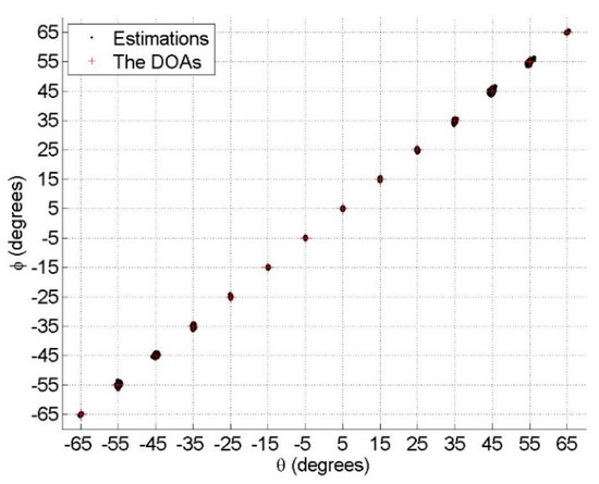 Based on Equation (29), one can apply the SORTE method [31] to detect the source number, and use the Tensor-MUSIC method described in detail in [19], to achieve 2-D DOA and polarization parameter estimation. In short, for the source localization and polarization estimation, the proposed model can be employed to do those with both the PARAFAC decomposition and Tensor-MUSIC. It should, however, be noted that, using the PARAFAC decomposition to do estimates, one cannot only avoid the multidimensional spectrum peak search but also improve the estimate performance because the data structure (e.g., Vandermonde) of is capitalized on enhancing the estimation accuracy further [23,32].