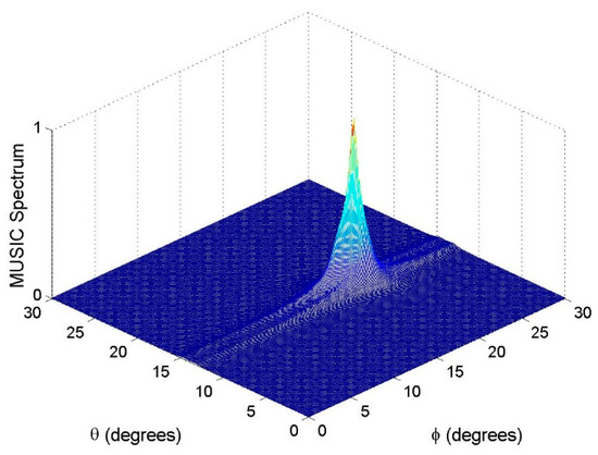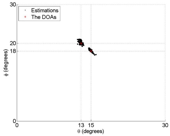 Assume that there are two close sources in a surveillance region. The two sources with the 2D DOAs as and and polarization parameters as impinge on our nested vector-sensor array. For the purpose of intuitive demonstration, the polarization parameters are assumed to be known. The estimation results with the SNR = 20 dB and T = 500 are shown in Figure 3, Figure 4 and Figure 5, respectively. From these figures, one can see that the method in [19] cannot distinguish the two close sources, while both the proposed method and the benchmark can resolve them. It must be emphasized that 12 physical vector sensors are used by the benchmark, whereas six are used by the proposed method.