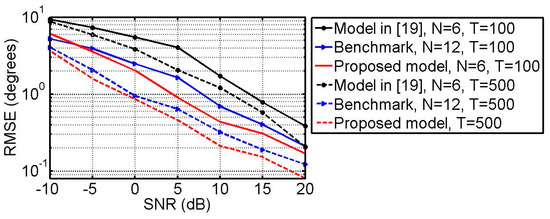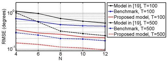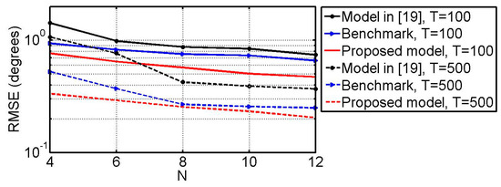 A source with the impinging direction and polarization parameters is taken as an estimated example. Figure 6 plots the RMSE of the DOA estimates as the function of SNR with and . Figure 7 plots the RMSE of the polarization parameter estimates versus the SNR with and . From Figure 6 and Figure 7, one can find that in all cases the proposed model with N = 6 outperforms the one in [19] and is very close to the benchmark with N = 12.