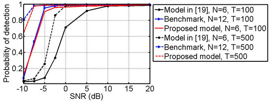 In the following simulation, the source number detection performance of the models is investigated. Two sources with , , and () are taken into consideration. The detection accuracy is defined as , where is the trial number, and is the number of times when the detected source is true. In this example, . The probability of detection versus SNR with and are plotted in Figure 8. One can see from Figure 8 that the detection performance is improved when the SNR and snapshots are increased. In addition, it can also be seen that the proposed method considerably outperforms the one in [19] and performs very close to the benchmark.