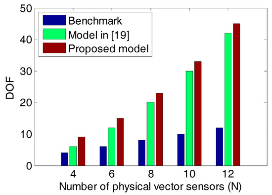 Thus, applying the PARAFAC decomposition to the proposed under the conditions Equations (28) and (29), one can identify up to sources (corresponding to DOF) for the nested array with N electromagnetic vector sensors, and up to sources (corresponding to DOF) for the one with N acoustic vector sensors. In contrast, the method in [19] could resolve sources (corresponding to DOF) regardless of the electromagnetic vector sensors or acoustic ones.