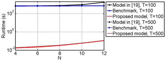 As mentioned in [24,26], the computation complexity of the PARAFAC decomposition–based method involves many iterations and largely depends on the received data. Hence, the CPU running time of the proposed method is provided as a reference in this example. All of the compared methods here are implemented in MATLAB R2011a using a PC with Inter(R) Core(TM) i7-6500U CPU @2.50 GHz and 8 G RAM. The simulation conditions are the same as those of example 6.5. All of the simulation results are obtained via 100 Monte Carlo trials. Note that the angular resolution of the benchmark and the method in [19] is fixed to . The running time for all of the compared methods with respect to N is presented in Figure 12. From Figure 12, we can see that for each method the number of snapshots (i.e., T) does not have much affect on the running time. It can also be seen that the proposed method takes the least time for all of the cases.