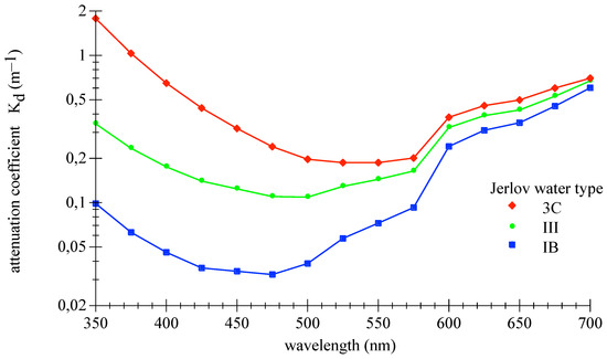 Spectral diffuse attenuation coefficients, , of downwelling irradiance for three Jerlov water types, replotted from database [25].