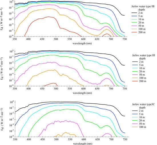 Solonenko and Mobley [25] estimated the fundamental inherent optical properties, i.e., absorption and scattering coefficients of the water constituents, of all Jerlov water types. For our investigations, their derived parameters have been used to run radiative transfer simulations with Hydrolight (version 5.2, Numerical Optics Ltd., Devon, UK); please refer to [27] and to the Appendix A.1. The numerical model computes the in-water radiance distribution as a function of depth and wavelength and provides many other quantities of interest to optical oceanographers.