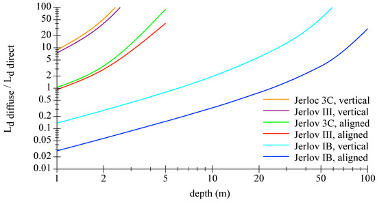 Graphic showing the ratio of the diffuse to the direct radiances as function of the water depth for Jerlov water types IB, III, 3C for a sensor looking vertical upwards or aligned direct to the sun. Data were generated with Hydrolight for a specific wavelength of 450 nm.