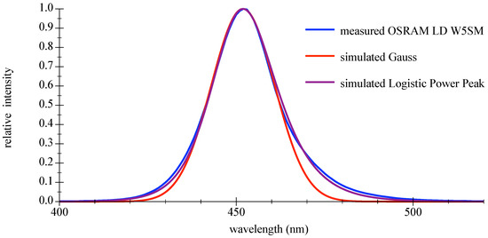The use of the LED radiant emission is dependent on the spectral coverage. The device under test (DUT) was a high-power LED LD W5SM (OSRAM Opto Semiconductors GmbH, Regensburg, Germany), driven at mA measured with a BTS 256 spectrometer (Gigahertz Optic GmbH, Türkenfeld, Germany). The peak center was determined to be 451.9 nm with a FWHM bandwidth of 21 nm. For model functions and parameters please refer to the appendix in Appendix A.2. Graphics in Figure 4 show the measured relative spectral emission of the deep blue LED as DUT compared with the commonly used Gaussian approximation and the better matching logistic power peak model function; please refer to [33]. A comparison is given in Table 2.