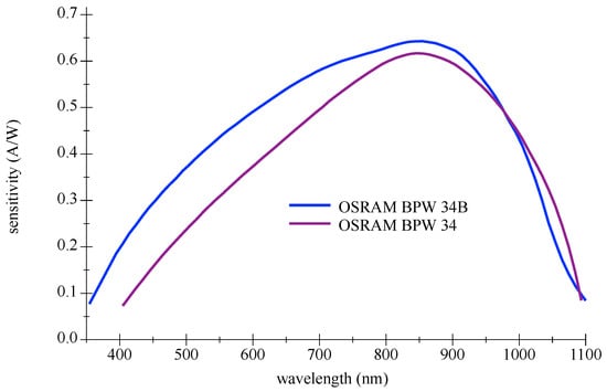 Spectral sensitivity curves for OSRAM BPW 34 and BPW 34B Si PIN Photodetector. Redrawn with values from datasheets [34,35].