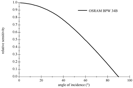 A commonly used Si PIN PD is the BPW 34B (OSRAM Opto Semiconductors GmbH, Regensburg, Germany), it is blue enhanced and suitable for the combination to a deep blue LED. Figure 5 shows the difference to a standard non-enhanced BPW 34 detector (OSRAM Opto Semiconductors GmbH, Regensburg, Germany). This planar off-the-shelf type offers a large FOV; please refer to graphics in Figure 6. Furthermore, their relative low capacitance facilitates higher frequencies. As is typical for Si PIN PDs, the maximum of the sensitivity is around 900 nm in wavelength and still significant at 1100 nm.